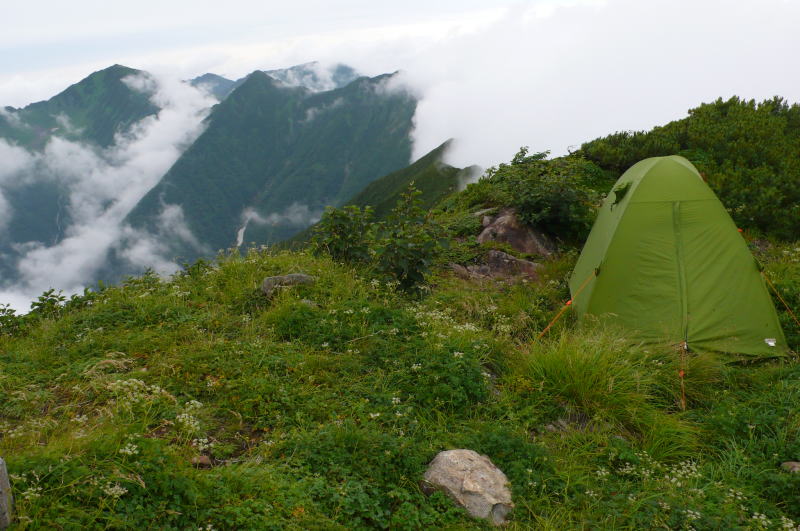 1737mのピークを下りたすぐにある隠れ家的なテン場 十勝側にあって西からの風雨を避けるのにもってこいの場所