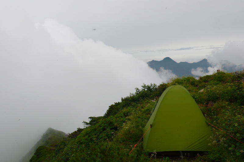 ハイマツ帯をポッと抜けると1823峰のピークであった。(15:50) そしてピークの手前にはテント一張り分のスペースがある。あまり頻繁に使われることのない場所なのだろう。ポコッとした3つの草の塊がテントの下になる。コイカクシュサツナイ岳方向の展望はないが、カムエクが、ピラミッド峰が、1807mが見える。歩いてきた稜線は濃いガスに包まれている。吹きさらしのピークのテン場だが、風は強くない。風上の2か所の張り綱を、岩石を包むネットに繋ぎ、急な天候の変化に備える。
