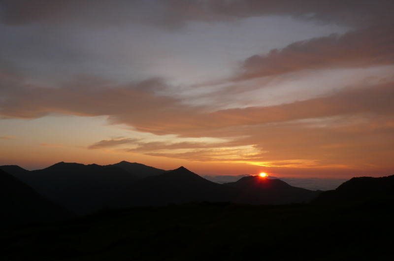 昨夜からの雨は未明に収まった。テントを出てみると星が少し輝いているのが見える。ころころと変わりやすい天気が続いているので、行程中のどこで悪天候に見舞われるか分からないが、このまま停滞したり引き返すのも芸がない。1日遅れで1823峰へ向かうため、すっかり雨に濡れたテントを畳み支度を整える。昨日のピラミッド峰やカムイエクウチカウシ山の往復と違って、水を7リットル背負っての長丁場である。ハイマツも濃くなるだろうから合羽を着て歩く場合ではない。全身水浸しを覚悟で進もうとザックを背負い先を見る。(05:05)