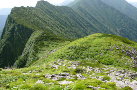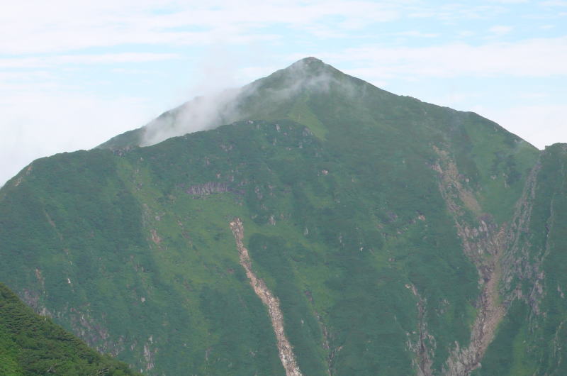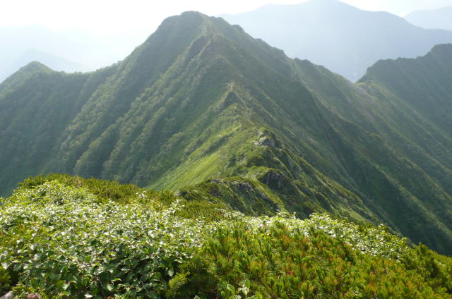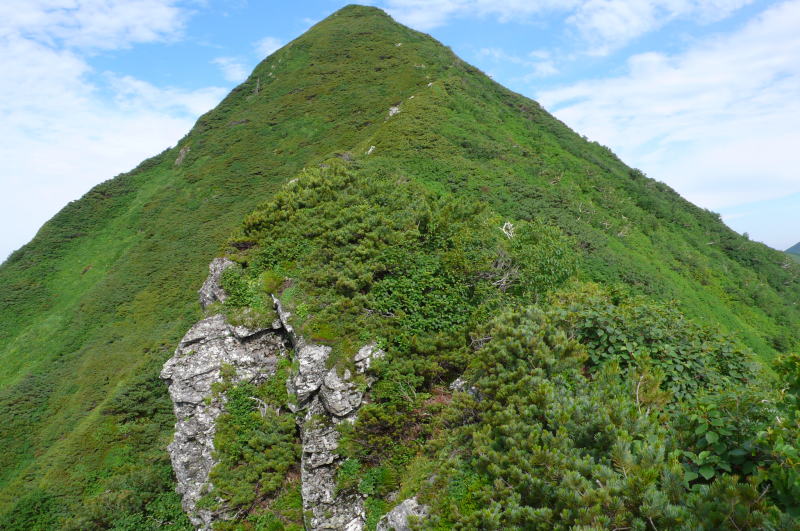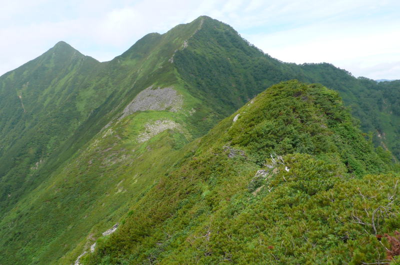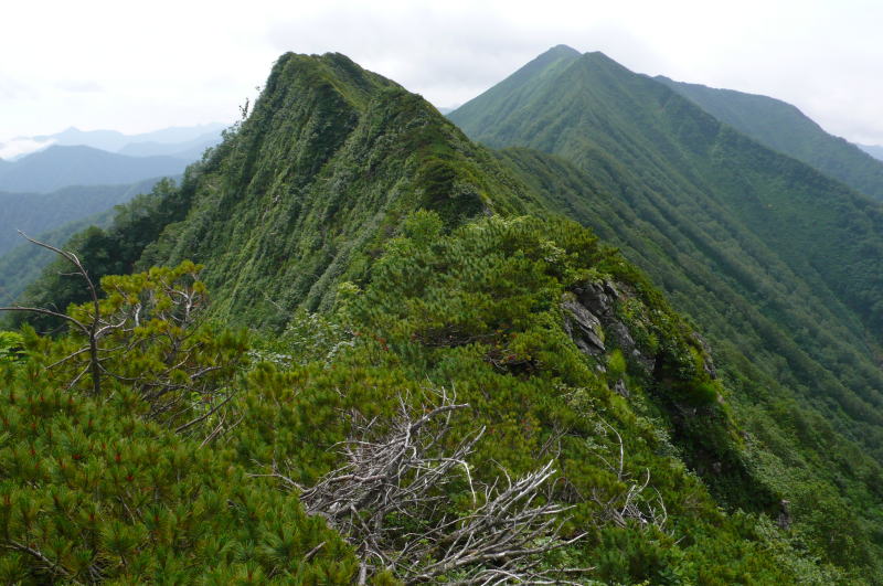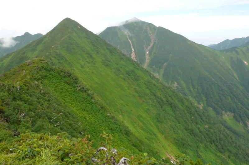 昨日はコンコンと湧き出していた登山道上部の水の流れはすっかりない。楽をしようとカールで水を汲んでこなかったらヒグマの存在も含め面倒なことになっていた。稜線に出てからはすぐハイマツやミヤマハンノキの枝や葉に着いた水しぶきの洗礼を受ける。ただ、これがスラックスを伝わって、あるいはヌバック表皮のゴアテックスの登山靴のポンプ作用によって登山靴の中が水浸しになるまでのものではない。この天気ならそのうちに藪の水もなくなるだろう。