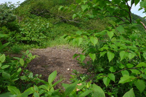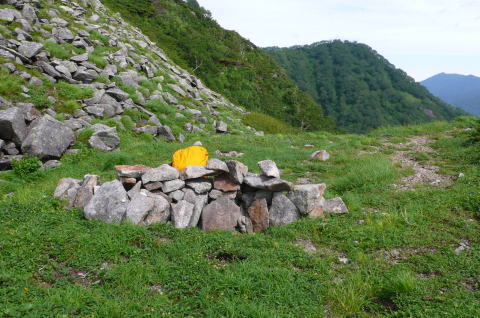 | 1602mのコルをピラミッド峰方向から見る。 | コルに一張り分の石積みのスペースがある。主に日高側から風の通り道となっているのだろう。 | |