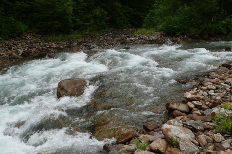 あかしやトンネル先のゲートを出発し、七ノ沢出合でユースホステルで準備してもらった朝食のお弁当を食し七ノ沢を跨ぐ。水量は多いが支障となるものではない。札内川も水量は多いが、水は澄んでいる。しばらく河原を歩き最初の渡渉となる。水かさは膝頭まであるが、ここを渡ることができればめっけもんだ。棒切れを支えに川に入る。どうにか切り抜けた。よ〜し、これなら先はなんとかなるだろう。ほとんどが巻き道歩きで、3回だけの渡渉で八ノ沢出合のテン場に着く。(07:45〜09:35)