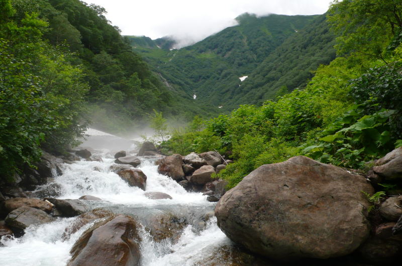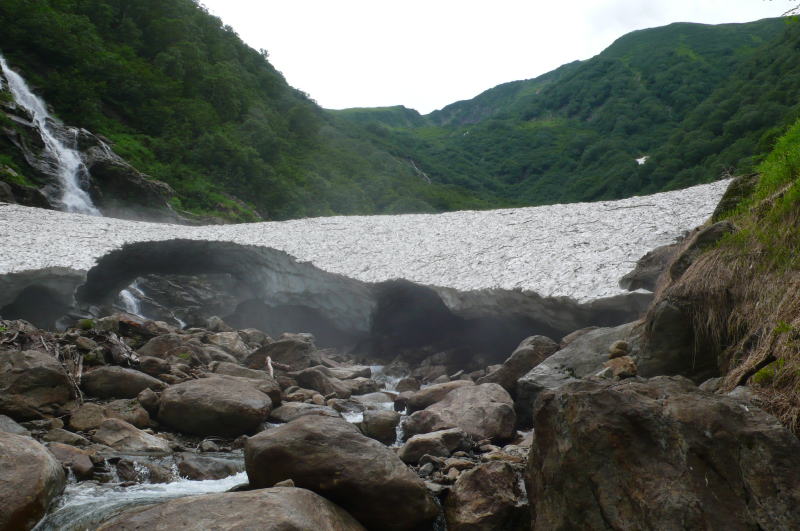 右岸から土石が顕著に八ノ沢に流れ落ちている地点(二股)で、カムイエクウチカウシ山と八ノ沢カールが姿を現す。相変わらず水量は多い。今年は雪渓も多く残っている。最初の雪渓付近でギョウジャニンニクを数株採る。今回は野菜としてキュウリとスープ用のたまねぎと人参を持ってきたが、みずみずしいギョウジャニンニクでさらにスタミナアップを図ろう。次の雪渓脇にテントが見える。声を掛けると、エサオマントッタベツ岳から入って今日で10泊目という東京在住のご同輩だった。沢の増水を懸念して、水が引くのを待っているという。
