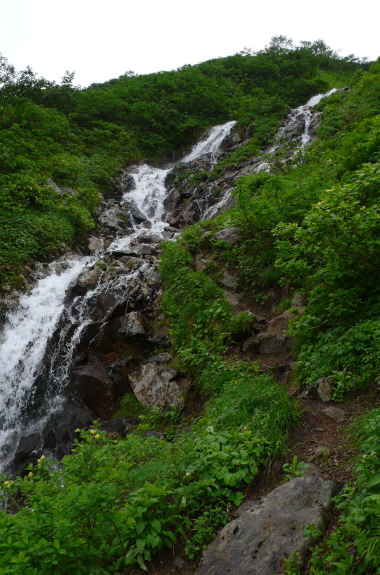 昨年、一昨年と2度登ったカムイエクウチカウシ山ではあるが、これほどの雪渓が残るのは目にしていない。自由人がテントを張る場所から三股までは例年にない量の雪渓で埋め尽くされている。(09:35〜12:30) これまではエサオマントッタベツ岳からの下りでしか使ったことのない登路である。沢靴から登山靴に履き替えて、さあ出陣と出発したが、これが間違いで最後まで沢靴で通すべきであった。急にきつくなる傾斜に、つるつるした岩場は登山靴を容易にスリップさせる。最初の洗礼のシャワークライムをどうにかクリアし、滑落に気を付けながら進む。細かなルートの取り違いはあったものの、進むべき沢筋をきちんとおさえ、シラネアオイが咲く最後の傾斜を無事登り切ってから右岸に取り付き、そのまま念願の八ノ沢カールに入る。