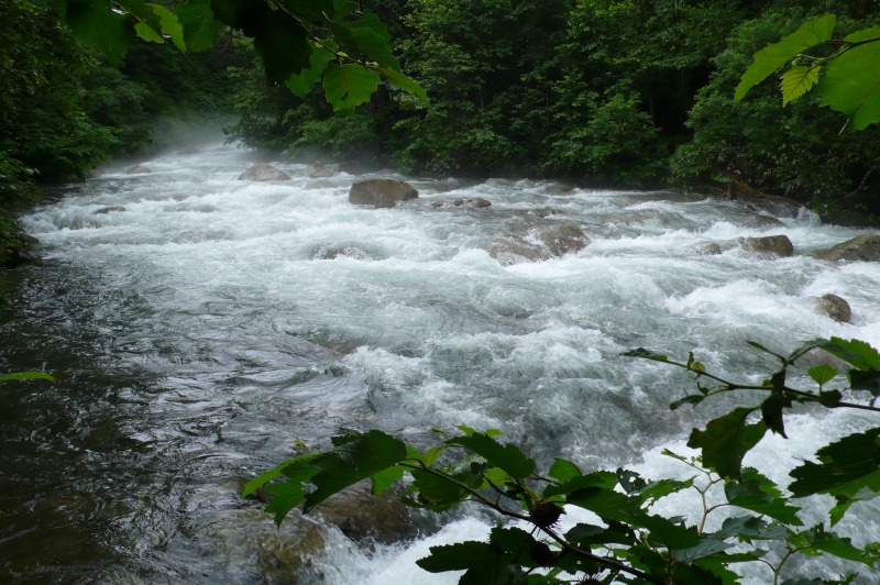 午前4時、目覚ましで起きる。部屋の窓を開けると雨は降ってはいない。薄いガスがかかっている。もう日の出の時刻に近いというのに空に明るさが見られないばかりか鉛色なので、山は既に雨が降っているだろう。出発時刻の5時、帯広八千代ユースホステルのオーナーの案内を受け、戸蔦別川林道に向かう。車中から見える戸蔦別川は大荒れに荒れている。オーナーに「普段の2倍ぐらいの水量でしょうかね。」と自分にとって都合のいいように聞くが、その答えは「今日の水はそんなものではないですよ。」と冷静な答えが返ってくる。
