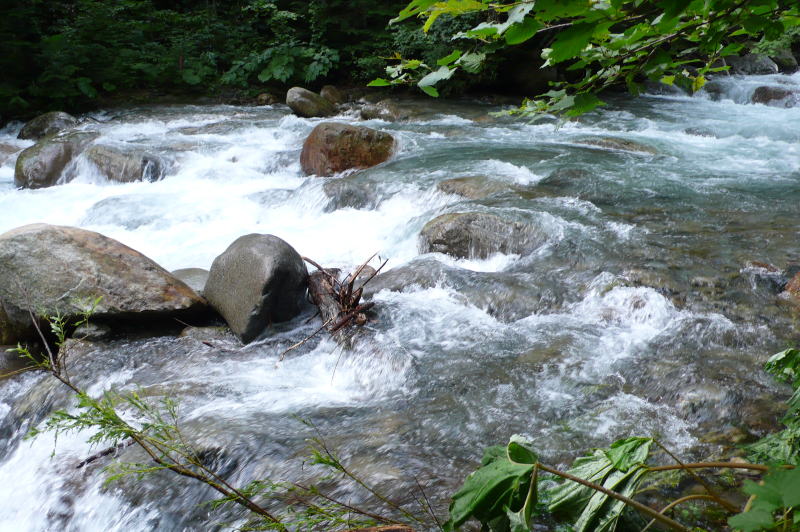 林道跡の日差しのないところの細い木を借用し、手を上げた長さ(2m強)の棒を作り枝を払う。減水したとはいえ、今も轟々と流れる川の中心部を突破するには、急な流れのところでは棒を川に刺し、足腰を安定させてすくわれることを防がなければならない。さあ、足腰を濡らそう、と川に入る。