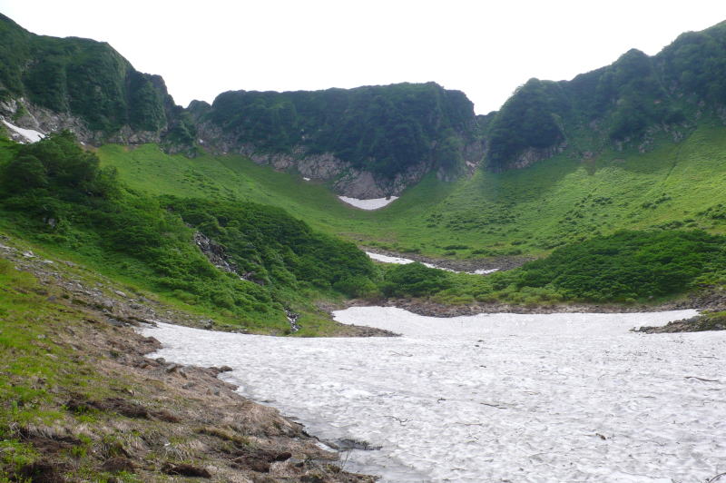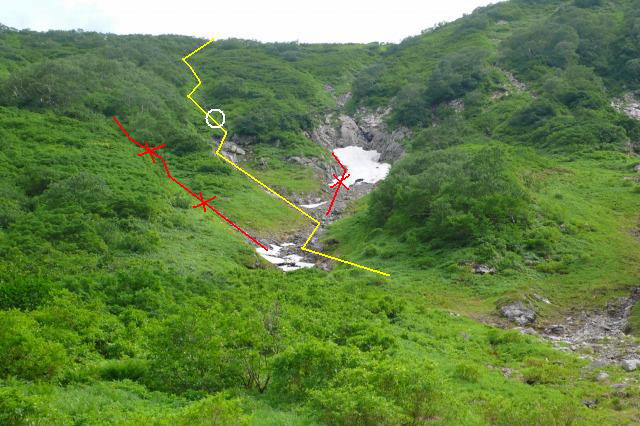 滑滝も水量が多いが、難渋するほどではない。1か所だけでプチシャワークライミングがあり、衣服を濡らした。この場所は、しかしながらこの縦走のハイライトの一つである。徐々に滝を登って北東カールをのぞく手前になると、屹立する岩にミヤマダイコンソウが咲いている・・・ハズであったが、今年はもう花が終わっていた。次のハイライトはカールで食餌中の熊の存否だ。