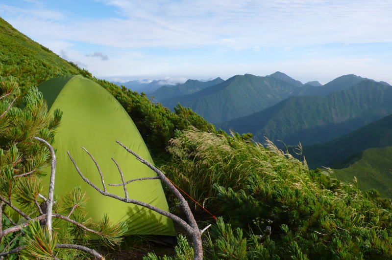 下降点から札内JPまでの稜線のハイマツは、控えめに、しかし要所がきちんと整枝されている。おかげで気持ちよく札内JPに到達する。JPにテントが張れるスペースがあるが、谷から風が吹き上げてきていて、明日の天候を考えると適地とは言えない。快適だからと言ってエサオマントッタベツ岳との鞍部にあるテント場まで行くのもかったるい。「そうだ、地面はならされてはいないが、登山道にハイマツで覆われたスペースがある。」と、JPからエサオマントッタベツ岳方向に少し下りた場所に向かい、テントを張る。そこは2007年の縦走時のテント場の記録を見ると、「札内岳JPからエサオマントッタベツ岳へ向かう途中にある。草が生えていて使用の痕跡少ない。北東カールを眺めることができる場所なので、風が強く吹かないときによさそう。 」と書いている。