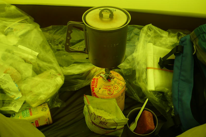 この日撮った画像は1枚だけ。食べた物は、α米1袋に乾燥カレーだけ。行程管理人には14時06分、「まだ雨、暇なのでワインを飲んでいる。」とメールを打つ。しかし、ザックに忍ばせて持参した赤ワインは、このときもうほとんど飲んでしまっていた。そして、日本酒もなくなって・・・。