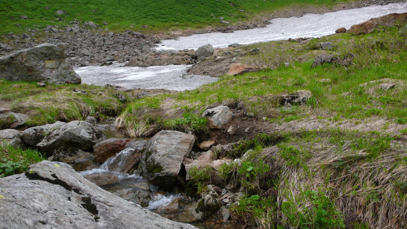 午後2時までに札内川ヒュッテに下りる必要がある。追われるように雨も降りてきた。テントを撤収し、朝の冷たい源頭の水を口に含んで沢に向かう。源頭からしばらく下りたところで、彼方に単独男性が登って来る。だんだん近づいてくると、鮮やかな色のシャツをまとった人であり、八ノ沢出合での救出騒ぎがあったばかりのカムイエクウチカウシ山を登る単独の人は、「学生さん」かなと思っていた、その人はホームページ「オジロワシの空の下」の「たかさん」であり、思わずうれしくてなつかしくて「千歳のたかさんですか。」と声を掛けてしまった。たかさんが差し出した手を、がっちりと握る。遭難事故が続いている厳しい時期の日高山脈、カムイエクウチカウシ山での男と男の挨拶であった。