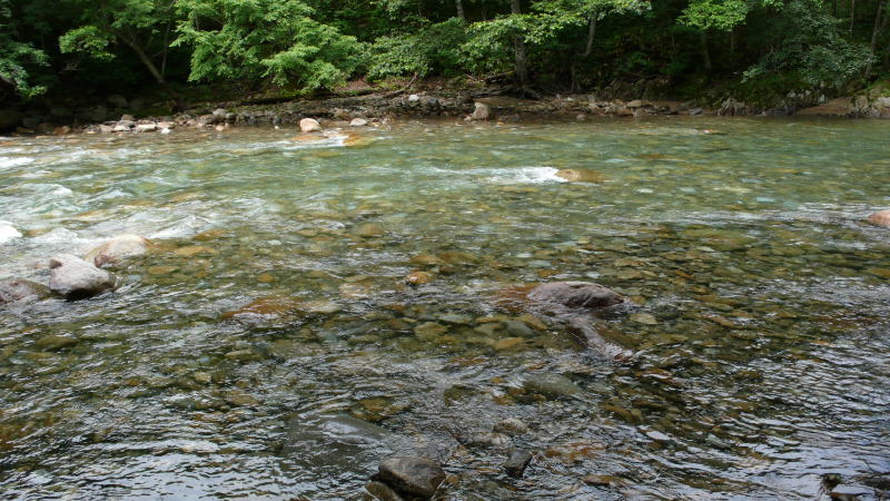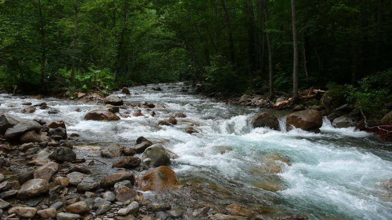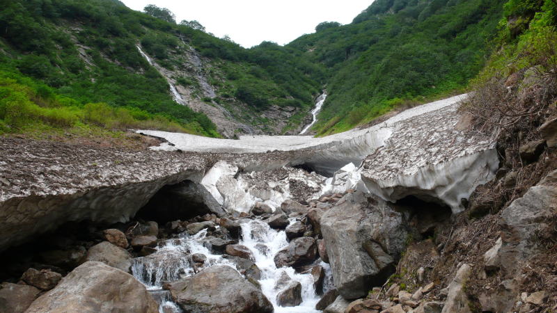 三股をやり過ごすと、もう緊張を強いられる場所も少ない。雪渓を過ぎると、右に左にと巻きながら歩く。今回の増水の跡は想像を超える広がりを見せている。水かさも相当程度のものであったろう。八ノ沢で渡渉できずにいたツアー登山者が救助を求めた状況は理解できる。