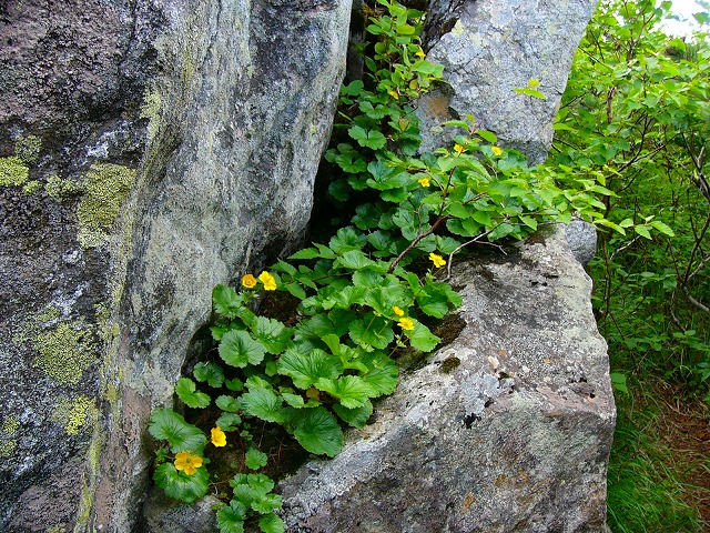 途中,岩場の隙間にミヤマダイコンソウが取り付いていたが,場所が場所だけに一瞬,カムイコザクラかと思った。隣の国境稜線の尾根は岩場だらけであり,岩の色もいいので,イワザクラがびっしり敷き詰められているのではないだろうかと期待する。
