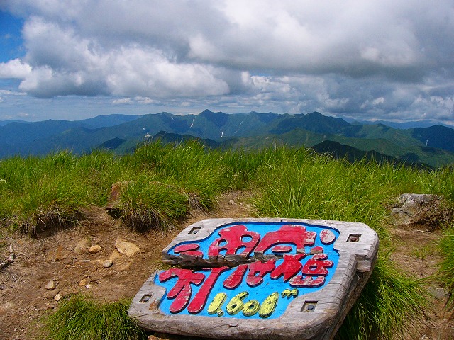 頂上からは日高の山が360度ぐるっと見渡すことができる。昨年苦労したペテガリ岳東尾根コースも遠くに見える。山頂には涼しい風が吹き寄せていて,清々しい昼のひとときを過ごす。山頂でゆっくりとした昼食の時間を過ごして,苦労して登ってきた道を引き返すこととする。