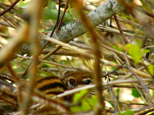 じっと潜んでいて身じろぎもしない 「もう行くよ」と音を立てるとシマリスはやっと動いた