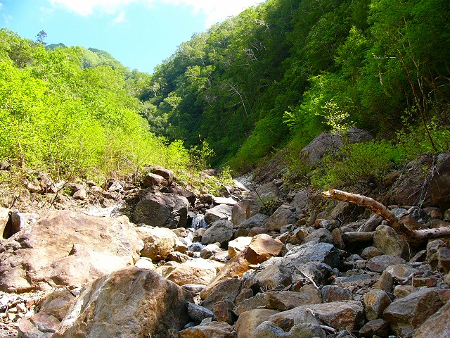 登山道の脇の太い木からシマリスが下りてきて藪の中に身を隠して動かない。デジカメを出して何度もピントを合うようにとシャッターを切るが,シマリスはじっとしている。自分は隠れたつもりでいるのだろう。でも,目が緊張しているのが分かる。沢はところどころ天井川となっていて,増水したときの自然の力の大きさが思いやられる。大きく迷うこともなく無事下山できたことが,今回の収穫であった。