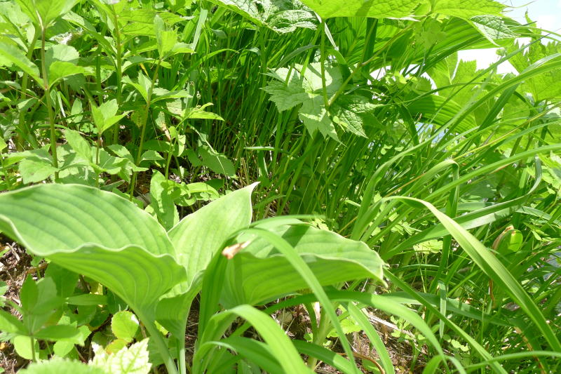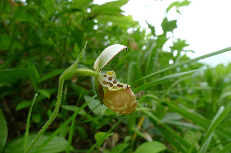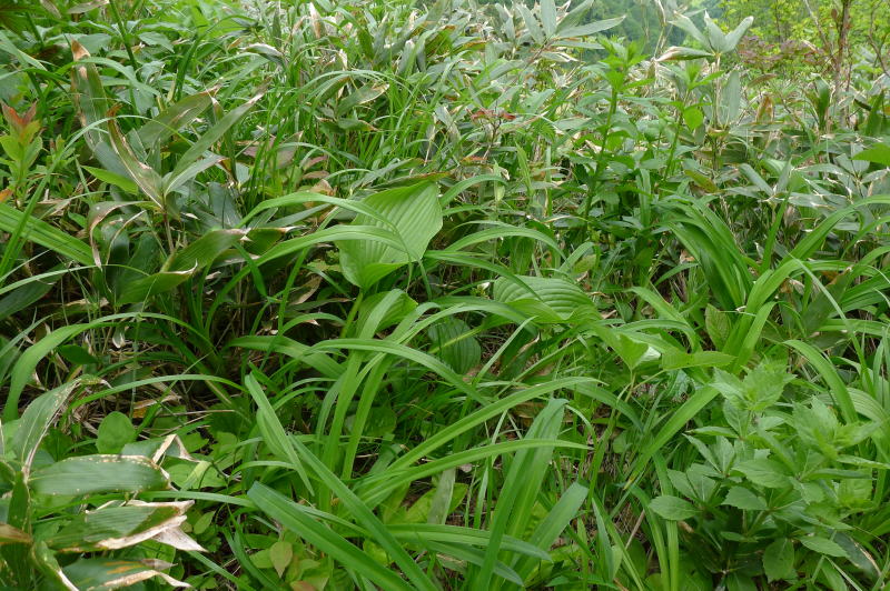 大きな笹や背丈のある草の中(2)にあって、何株かのアツモリソウを従えている。