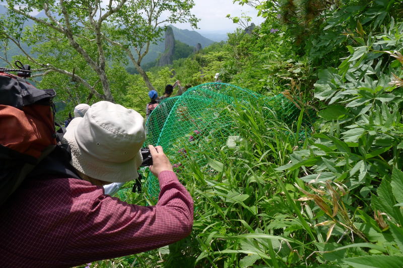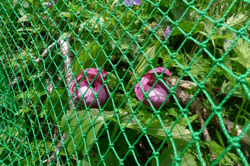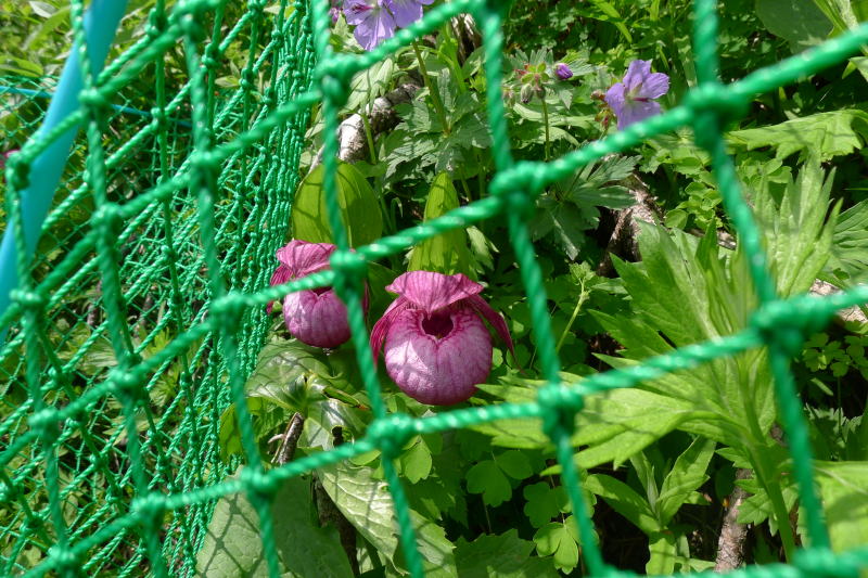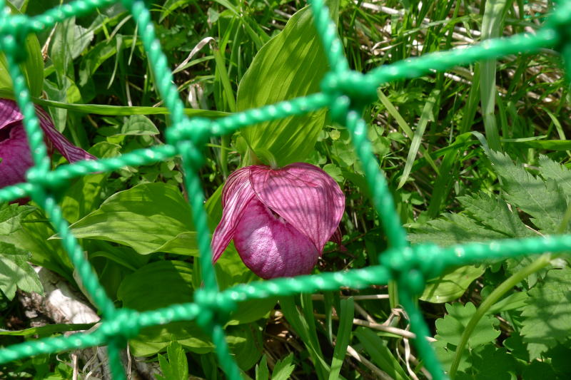 頂上基部のホテイアツモリソウなどの楽園を見ると、ほどなく下山の時となってしまいました。下山路にもホテイアツモリソウはありますよとのことでした。そのとおり、あるにはありましたが、いずれも虜の身になったホテイアツモリソウだったのです。・