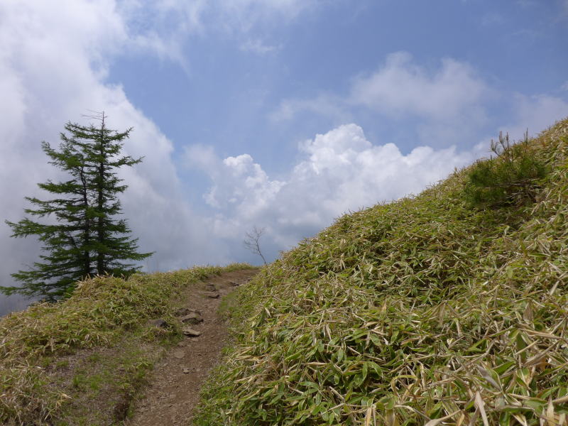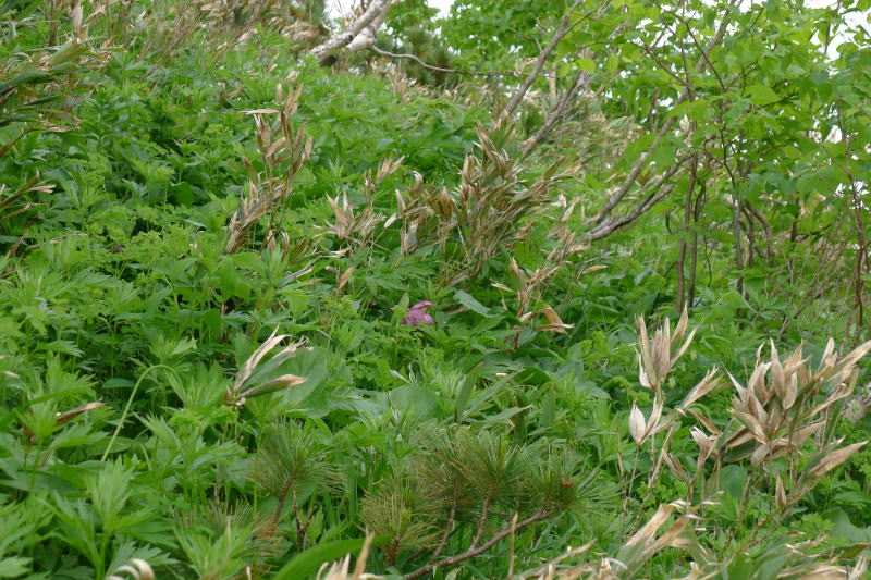 このモニター登山会では多くのことを学びました。そのことについては、あらためて別なページに記録しようと思うのですが、学んだことのひとつに、ホテイアツモリソウは、「誰かに見てもらいたいんですよ。隠れてばかりいては嫌ですよ。」と言っているということです。下山が始まると隊列を崩したり、写真を撮るのに人を待たせたりすることはなかなか憚られることでした。それでも、笹薮の中のホテイアツモリソウを見付けた時は、「見てほしい。」と草むらの中にじっと潜んでいるのではなく、視線をこちらに向けているような気がしました。このことは、今回のモニター登山の前に訪ねたほかの2か所のホテイアツモリソウが、まったく同じようなことを言っていたので、これはホテイアツモリソウの共通語のような気がしたのです。それとも妄想でしょうか。