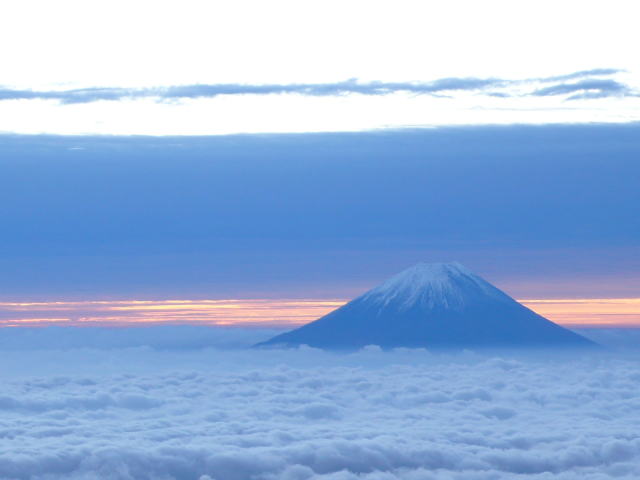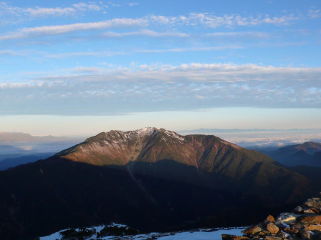 ジーンス履きのテントの青年が小屋に入ってくる。「隣のテントの人はもう出発して行きました。夕べは寒くて寒くて大変でした。」「銀マットが飛ばされてしまいました。」と寒風の中のテントは大変だったようだ。「水がないのですがどうしたらいいですかね。」と言うので、ストーブに掛かっている鍋の水をもらっていくか、北岳山荘で買うかどちらかにしたらと言っても、どちらにするというでもないから、外に出て日の出を待った。