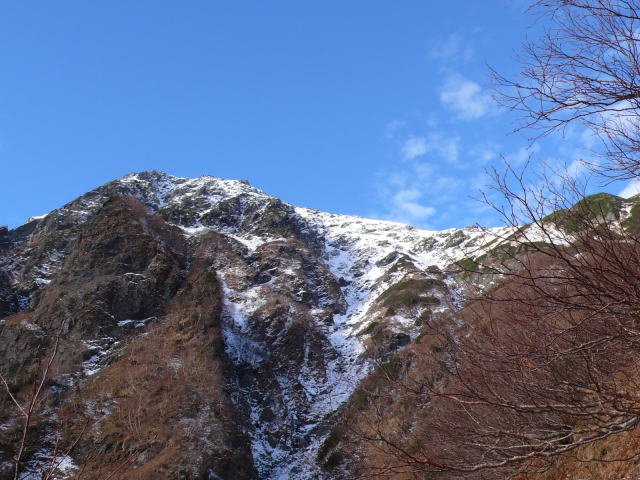 韓国の青年は熟睡したようだが、元銀行マンは「寒くて寝られなかった。」と言う。韓国の青年はゆっくり下りて芦安の旅館に泊まり、元銀行マンは「もう仕事に行く必要がないのでのんびりしながら決める。」と言う。自分はいつものように芦安での、のんびりした入浴タイムと昼寝が待っているので、午前11時出発のバスに乗らなければならない。朝食を済ませすぐさま小屋を出てアイゼンを装着し、小太郎尾根分岐へと急ぐ。登山道の雪はしっかり締まっていて、すこぶる歩きやすい。岩場の急斜面だけを慎重に下りるとすぐ分岐に着く。