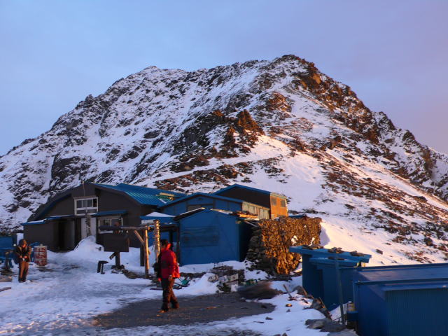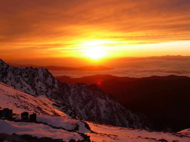 「いやぁ、昨晩主人に電話してテントを張る人はいないよ、と言われたんですよ。」と話していたところに、男性がのっそりと小屋に入ってきて、テントの申し込みをした。主人が言っていたとおり、テント場には雪が積もっていたが、鮮やかなグリーンのテントが白い雪の上に張られた。そのまま外で夕陽が沈むのを待っているほんの5分ほどの間に、手袋をしていない指がすっかりかじかんでしまい、小屋に戻ってストーブにかじりついてもしばらくの間感触は戻らず、軽い痺れが残った。小屋の風の当たらないところにある寒暖計はマイナス3度を示していたが、このぐらいの気温でしもやけ寸前になるとは思ってもみなかった。