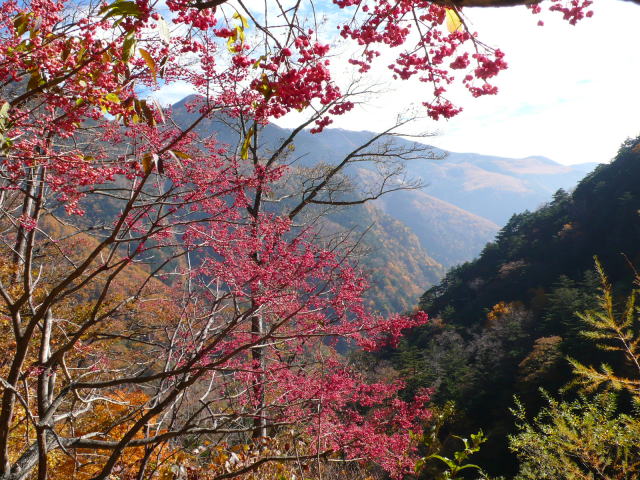 ラジオの天気予報は、今日の甲府市の最高気温は14度と言っているが、朝の大樺沢でも10度ほどもあり、汗を流しながら右俣コースを登る。当然のことではあるが、大樺沢にも右股にも花のかけらもなく、唯一、広河原からすぐの登山道脇に数本のマユミの木が赤い実を付けているだけだった。思いもかけずクリンソウが何事もなかったように緑の葉を広げていたのが目立った。