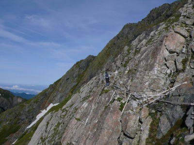 辛かったけれど、やっぱり来てよかった北岳南東斜面。キタダケソウを始めとする花々に囲まれて至福のときを過ごしたが、もう3時を過ぎている。缶ビールを雪渓に埋め、早くテントを設営して一息つかなければ・・・。南東斜面から岩場の急斜面を過ぎると昨年はなかった雪渓が待っていた。しかし、道はしっかり付けられていて安全に通過させてくれる。