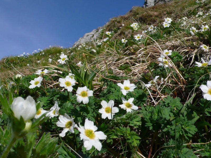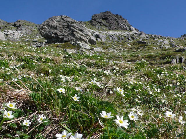 雪渓を離れると八本歯ノコルまで辛い梯子登りが延々と続く。コルからさらに普段はなんともない南東斜面の分岐までの岩場が待っている。今日の歩きは本当にしんどいが、花に逢うまでの辛抱とがまんすると南東斜面がキタダケソウやハクサンイチゲで真っ白に染められている。ミヤマダイコンソウ、キジムシロ、シナノキンバイソウ、オヤマノエンドウ、ミヤマシオガマ、チョウノスケソウもちょうど満開で、ミヤマオダマキは今にも紫の花弁を開こうとしているし、イワベンケイも咲きたくてむずむずしている。