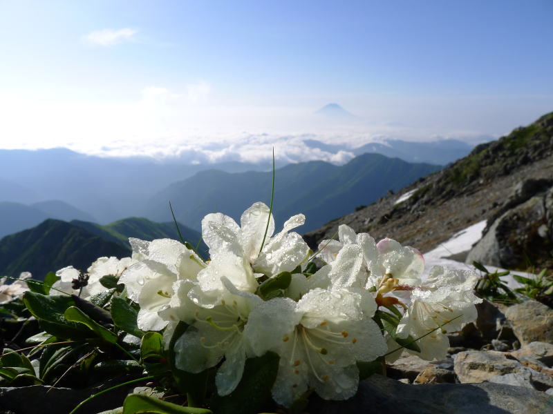 さて翌朝です。隣のテントで人が起き出し、出発の準備を始めているようなので時計を見るとまだ午前3時半でした。東の空が白々と明けてきたのでテントの外に出ると、リーダーから「早くからうるさくして申し訳ありません。」とお詫びがあったが、早立ちするそれなりの理由があったようです。小屋の食事が午前5時なので、それまではコーヒーを淹れて富士山を眺めたり、稜線に出て仙丈ヶ岳、甲斐駒ヶ岳や塩見岳をはじめとする南アルプスの山々を眺めます。