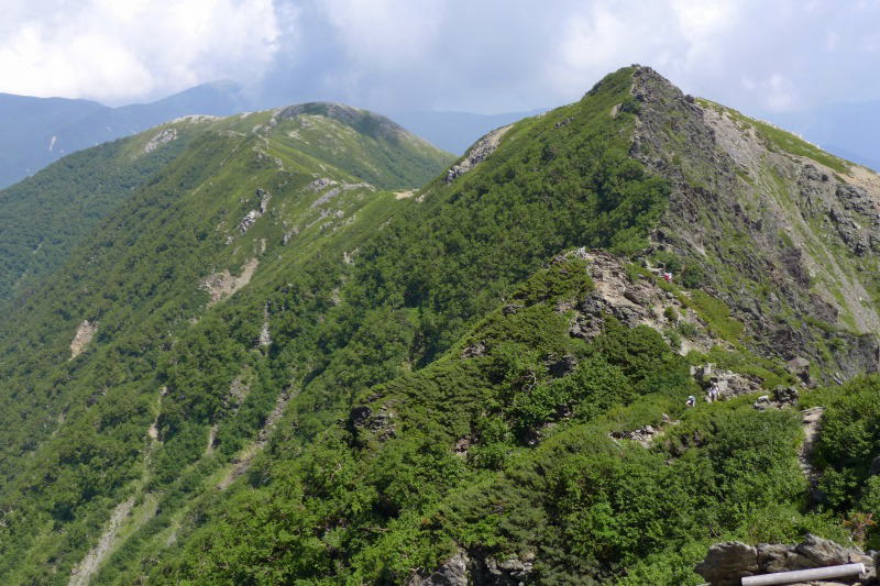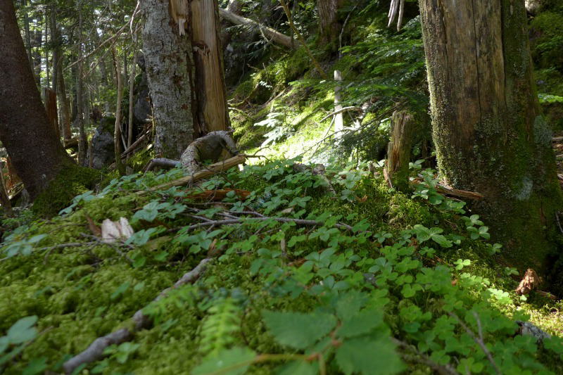 登り始めからしばらくは、カニコウモリがおびただしいほど繁茂して樹林下を覆っている。太陽が時たま射し込む樹林下は大変な暑さである。惰性で2枚重ねしている厚めのウールのTシャツが暑さを倍加させる。いつもは2日かけて飲むポカリスェットを、今回は2度で空にしてしまった。普段はあまり腰を落ち着けて休まないが、30分ほど歩くとザックを下ろして息を整える。徐々に高度が上がっているのを励みに、歩みを進める。
