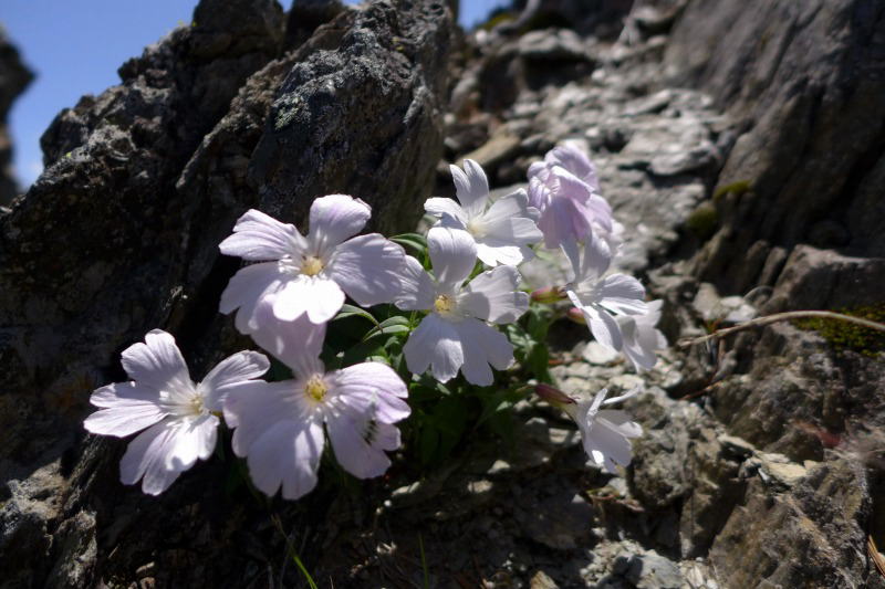 この幸せな昼寝で体力を回復し、八本歯ノ頭へと向かう。ここでの楽しみはタカネビランジとの再会である。時期的には遅いが咲き残りはあるだろう。八本歯ノ頭から垂直に下るとそこいらにいっぱいタカネビランジが咲き残っていた。大樺沢からは次々と人が登ってくる。閑散としたというより、登ってきた嶺朋ルートは、踏み跡の石を覆う苔が踏み付けによってもまだ頑張って残っていて、石が丸裸にはなっていないというのに(つまりここを歩くという奇特な人は年に数えるほどだろうに)・・・。(嶺朋ルートを使ったというネット上の記録も少ない。テープとペンキでのマークが導いてくれるが、踏み跡を見失ったときはすぐさま四囲を確認するか、いったん戻って丁寧・確実に踏み跡を探すこと。大樺沢側に切れ落ちた崩壊斜面があり、踏み跡自体もその近くを通るところがあるので、安全を第一に!)