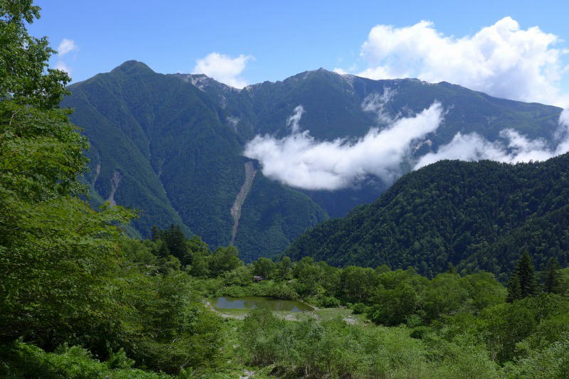 今回は雨を覚悟しての登山である。それほどエネルギーが満ち溢れている(わけはない)。ただ、山に登りたいだけのことだ。山梨交通のバスに揺られ南アルプススーパー林道の人となると、濃いガスが一瞬晴れて農鳥岳が姿を現す。これは幸福の始まりかも・・・。バスが広河原インフォメーションセンターに着くとガスはどんどん取れて、青空が広がってくる。