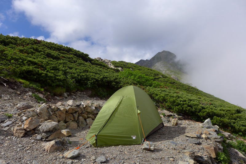 肩ノ小屋で小休止し北岳頂上を越える。北岳の南斜面の花は鹿の食害に遭うことはなく、まさには百花繚乱である。雨を覚悟で来てよかったと思う瞬間であった。この後、八本歯ノコル方向に下りてキタダケソウの残滓を探すが何も残っておらず、本命の南東斜面に入って北岳山荘を目指す。まだチョウノスケソウが残っているほか大好きなミヤマムラサキが待っていてくれた。アポイ岳に登ったときの吉田岳方向に咲いていたエゾルリムラサキは特に印象に残っているが、北岳のも千枚岳のミヤマムラサキも綺麗だ。週末は混雑するであろうテント場にテントは少なく、贅沢なポジションを占めてテントを設営する。まだ陽の高い時間に着いてしまった。熱がこもった今年手に入れたアライ・エアライズ1の中でぬるくなったビールを飲む。