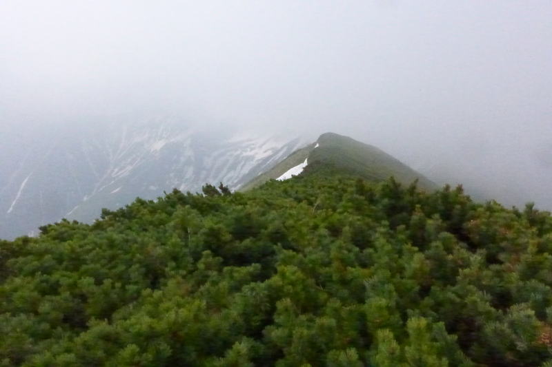 北戸蔦別岳から1904mまでの間は、いくらこの稜線が「日高の一級国道」と称されようとも、ひどい藪であった。藪というよりハイマツの海というべきか。ただ、その程度はエサオマントッタベツ岳〜カムイエクウチカウシ山の間とか、カムイエクウチカウシ山〜コイカクシュサツナイ岳の間とか、ペテガリ岳〜ヤオロマップ岳の間とか、ペテガリ岳東尾根コースとかいうところの藪のようなものでは全くない。それにしても水をたっぷり含んだハイマツやミヤマハンノキをかき分けて進むのはうんざりを通り越す辛さであった。