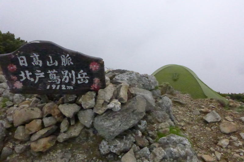 午前2時50分、アラームが鳴る前に目覚めた。前夕のうちに作っておいた今日の朝食のタンパク質系のおかず(ハムエッグ)とシリアルなどを食し、出発の準備をする。そとは濃いガスに覆われている。夜明けが近い時刻になっても空は赤みが射してこない。雨は降っていないがハイマツがたっぷり雨粒を蓄えているのでレインウェアーを着込むが、たぶん破れてしまうだろうな〜。