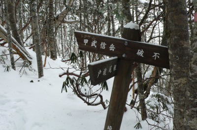木賊山の斜面を下るとそこは吹きさらしとなっていて、踏み跡が消えかかっているがその距離はわずかで、すぐ樹林帯に入るし、標識もあって、「甲武信小屋600m、木賊山400m」と書かれていて安堵する。