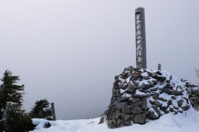斜面の崩れからの先は平坦な道となっていて、この先、頂上まではどのくらいあるのだろうかと思いながら歩いていると、樹林の間からぽっかりと頂上標識が見える。「やった〜。」と思わず声に出して頂上に出ると、四囲の山は雲に隠れていて姿を見せない。