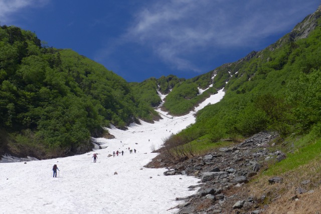 1869mのヌク沢からの道と合流する場所の「広瀬」までは、登山道にはほとんど雪はないが、その先はアイスバーン化したところや圧雪されて滑りやすくなっていて、さらに傾斜も急なので10本歯のアイゼンを装着する。