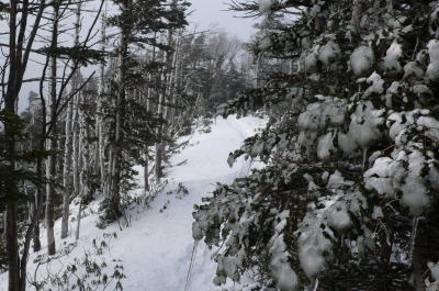 先ほどまでは、「今日は頂上に行かず、すぐ小屋で沈殿しよう」と思っていたが、小屋を見て急に元気が出てきたので、冬装備を満載した大型ザックを背負ったまま、頂上へと向かった。頂上への登山道は小屋の左脇にあるが、登山道の様相はこれまでと同様、樹林帯の中の急登である。途中、斜面が崩れたところに出るが、そこは樹林帯が切れていることから、強い風が吹き付けている。