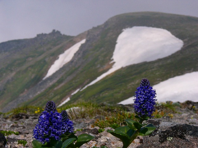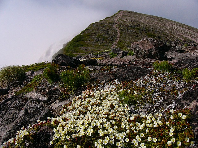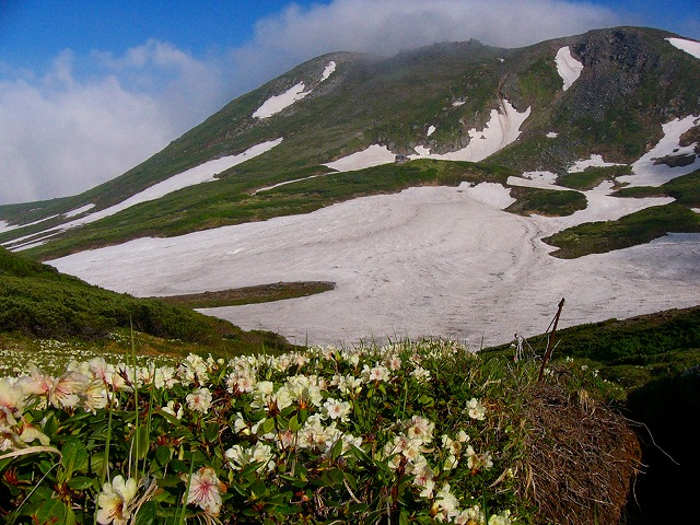 緑岳との鞍部を板垣新道に下りるが,チョウノスケソウは蕾も見せることなく,わずかにエゾコザクラやハクサンイチゲが咲いているだけである。