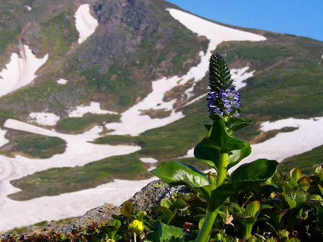 水場の流れにビールやトマトなどの野菜を置き,夕食時の楽しみとして,高根ヶ原方面に向かい花の状況を確かめる。小屋からほどなくしてすぐ雪渓となり,水もわずかに流れる程度で,昨年見たエゾコザクラやヨツバシオガマなどの姿はない。
