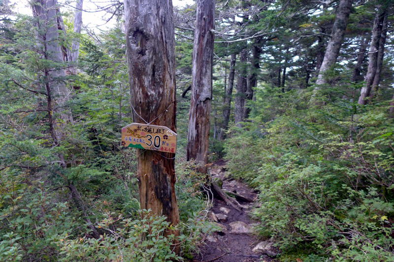 通常の朝一番(午前8時発)のバスに乗った人が到着するころになると10張りも張れそうもないテント場は一杯になり、あぶれ組はヘリポートに張らせてもらっていた。行程管理人にメールを打つため小屋裏のヘリポートから東へ7、8分歩いたところにある「三角点」の電波スポットへ向かった。ガスで視界はないがドコモの携帯でメールを送信することができた。国土地理院の地図上では2564.6mの三角点マークが表示されているところである。