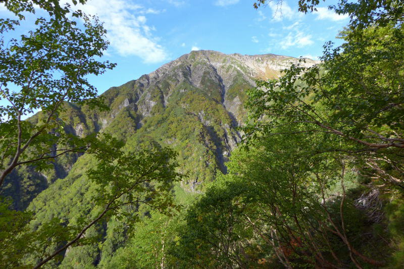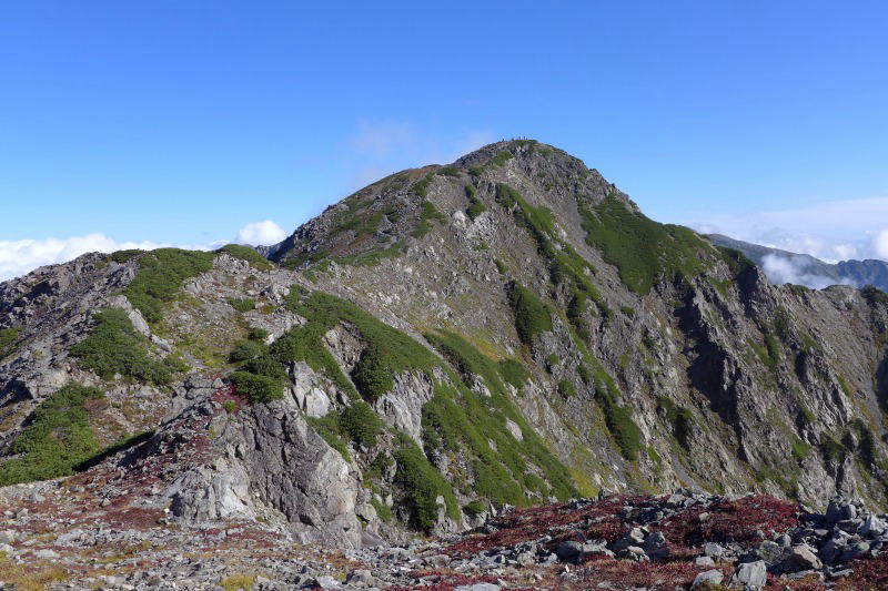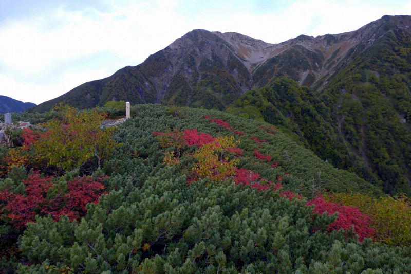 荒川小屋に泊まった人は多くがまだ陽の上がらない早朝から出発している。テント場も半数がもういない。小屋からまだ薄暗い樹林帯を歩き、ほどなくして南斜面に出ると低木が紅葉しはじめている。薄曇りの空がどんどんと晴れていく。