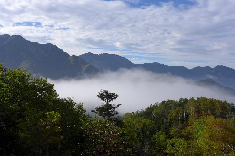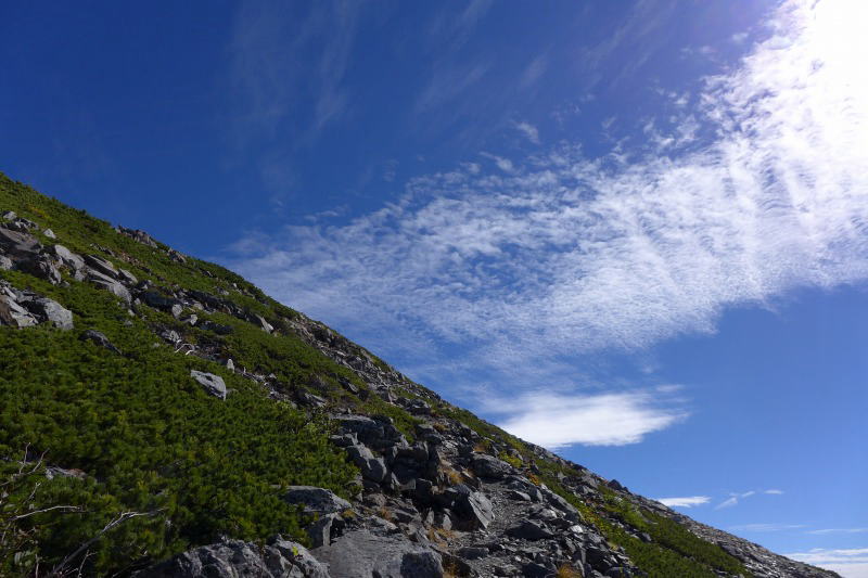 この付近の登山道は、樹林帯を抜けると視界の開けた若干の岩交じりになり、また樹林帯に潜り込むようなことを繰り返していくが、鞍部を抜けていくとハイマツ帯になって小河内岳への長い登りが始まる。もうそろそろピークかなと思うとそれは肩であり、なかなか到達しない。このころから青空が広がってきて、視界もよくなりようやく南アルプスの山を歩いているという爽快感が感じられるようになった。なんども騙されながら小河内岳へと登っていく。岩交じりの登山道ながら、歩きやすい。