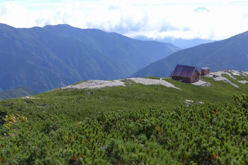 小河内岳から少し見下ろすこととなる小河内岳避難小屋は小河内岳から派生する別な尾根に乗っかっている。今回の縦走の計画を立てる際は、高山裏避難小屋に大いに興味がわいたもののこの小屋は興味の対象外であった。ところが、歩いてくる途中に見かけた小河内岳避難小屋は、稜線の上にちょこっと乗っかっていてマッチ箱のようなかわいい姿を見せていて、小屋をのぞくのが待ち遠しかった。
