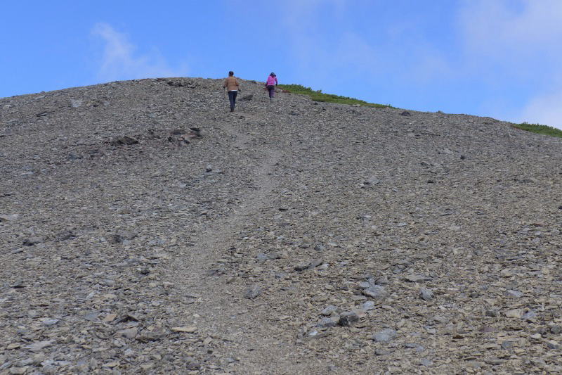 10年以上前に、ペテガリ岳東尾根コースを1泊2日で往復したときに水を切らし、2日目の午前中から下山できた深夜0時までの10時間ほど、水なしで歩いたことがあった。このときは、夜になってから熊笹の葉にかすかにたまった夜露を舐め舐め歩いたが、それは水分補給にはほとんど役に立たなかった。登山口に下りてから沢の水をがぶ飲みしたが、水の味はまったく感じられないかった。そんなことも思い出して通り過ぎた二人にお声をかけようとも思ったが、人を寄せ付けないほどの雰囲気の男性に圧倒されたこともあり、ザックには売りに出すほど水があるのにぁと思いながらも、先に進む。