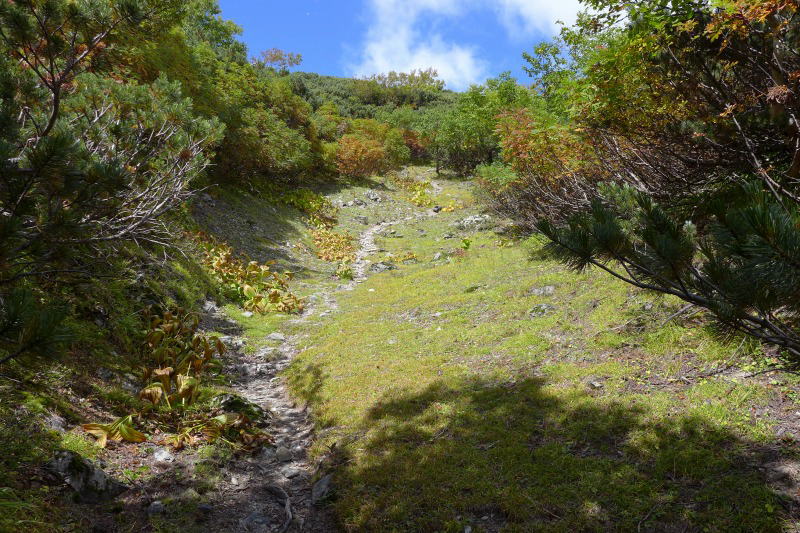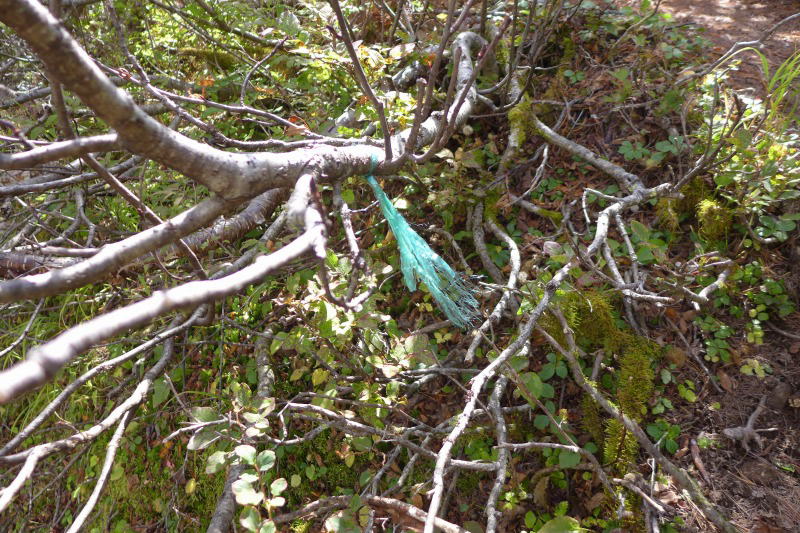 もうすぐで蝙蝠岳だというのに、出会った人はこれで4人だけ。本当に静かで煩わしさのない山だ。ところが、こんな素晴らしい自然風景の中に荷造り用紐をあちこちに括り付けたとんでもない勘違いをしている人がいる。それは北俣岳分岐から蝙蝠岳まで続いていたから、塩見岳から往復した者のことに違いない。これまで、このような貧乏くさいビニール紐を用いるのは年寄りだとの先入観を持っていたが、魔境・小黒界隈で比較的若い人がブログでその行為を正当化するような記述をしていた。自分のためのみならず、後の人のことを考えて括り付けているそうだ。蝙蝠岳のビニール紐は登山道に沿って延々と付けられていて、その偏執ぶりには驚くばかりだった。