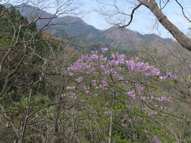 城山コースの登山道は、斜面の至る所に模造の木で階段が付けられています。これだと歩調が合わないので歩きづらいことこの上ありません。このコースの稜線の南斜面はどこも急斜面になっています。そしてミツバツツジがまばらに見かけるのですが、登山道脇のところにツツジの木はありません。近づけるところのツツジはみんな掘り取られてしまったのでしょう。