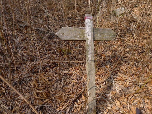 その後知らぬ間に檜岳(1451m)を通り過ぎ、1452mも何となく過ぎると徐々に登り一辺倒になります。枯れたスズタケの中を通り小黒(1650m)への登りとなりますが、ここも延々と辛いところです。途中「大日向」方面へ分ける道(標識はなし)を右に見て小黒へと登ると、まっすぐ正統に?尾根を行く道と斜面を巻く細い道(というより踏み跡)に分かれます。もう辛さ解消のために小黒と酉谷山の鞍部に出てしまえと細い道を選びました。途中古びた標識が立っていて「大日向」(左)「酉谷」(右)の字が読み取れます。これで楽ができると思ったのも束の間、道は90°曲がって山の高いほうへ向かって急斜面を登ることになってしまいました。あとからGPSの軌跡を見ると小黒頂上に突き上げていて、頂上では少し巻いて歩いていたようです。