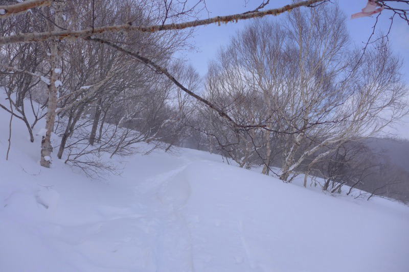 今回も、くろがね小屋までの間ではところどころ、吹雪でトレースが消えている。山の急斜面をトラバースするところでは大量の雪が堆積し、そこを一歩一歩、足でまさぐるようにしながら進む。途中、吹雪で鼻や頬がちぎれそうになったので、フェイスマスクを着用する。ようやくくろがね小屋が見えてくると、「くろがね小屋だより」にあるとおり、深い雪が待ち受けている。しかし、しっかりした雪なので、歩きづらいことはない。小屋前の吹き溜まりの雪が階段状に切り取られている。そこを下りて小屋に入る。